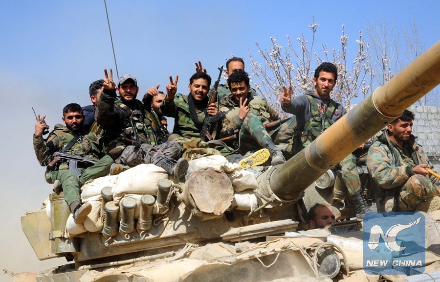 Syrian soldiers flash the victory sign on their tank in the town of Aftaris in Damascus' Eastern Ghouta countryside, Syria, on March 12, 2018. Syrian army captured on Monday the town of Aftaris in Eastern Ghouta, the latest town to be retaken by the army during the wide-scale offensive in that area, state news agency SANA said. (Xinhua/Ammar Safarjalani)