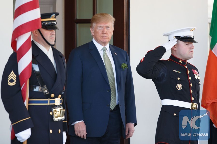 File Photo: U.S. President Donald Trump (C) waits for the arrival of Irish Prime Minister Leo Varadkar at the White House in Washington D.C., the United States, on March 15, 2018. (Xinhua/Ting Shen)
