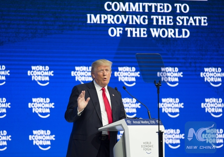 U.S. President Donald Trump delivers a speech during the 48th annual meeting of the World Economic Forum (WEF) in Davos, Switzerland, on Jan. 26, 2018. U.S. President Donald Trump said Friday that he would always put America first when it came to trade, but "America First" does not mean America alone. (Xinhua/Xu Jinquan)
