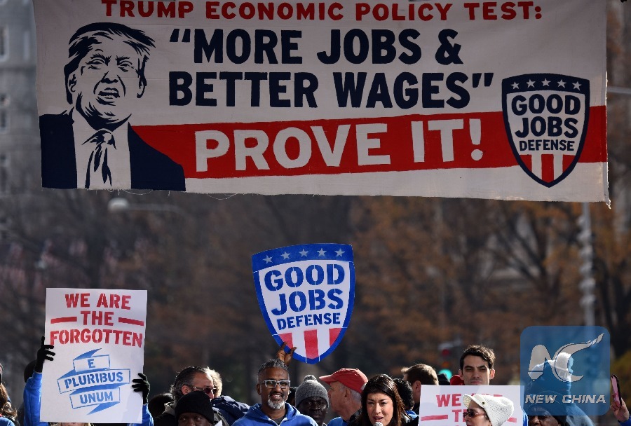 File photo taken on Dec. 7, 2016 shows people attending a rally calling for "more jobs and better wages" which was promised by Donald J. Trump during his campaign, in Washington D.C., the United States. With the United States retreating to the stronghold of protectionism and nationalism, concerns about a trade war are rising around the globe. (Xinhua/Yin Bogu)