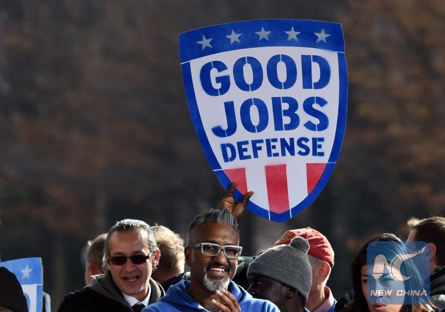 People attend a rally calling for "more jobs and better wages" which was promised by President-elect Donald J. Trump during his campaign, in Washington D.C., the United States, Dec. 7, 2016. (Xinhua/Yin Bogu)