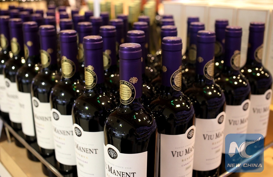 Bottles of Chilean wine Viu Manent are displayed at a Duty free shop in Santiago's international airport, Chile, June 25, 2017. (Xinhua/REUTERS)