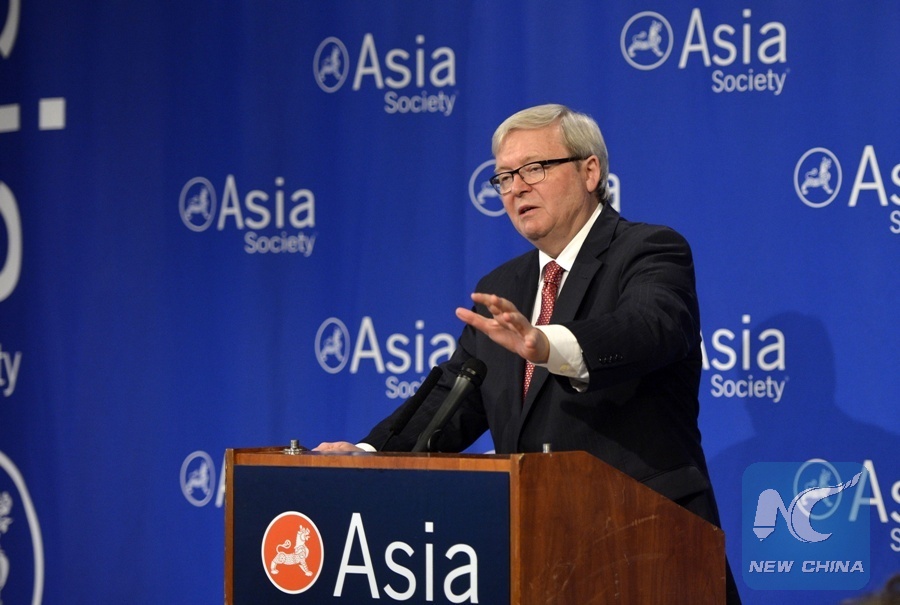 File Photo: President of the Asia Society Policy Institute Kevin Rudd, a former Australian prime minister, delivers a speech at the Asia Society in New York, the United States, May 4, 2015. (Xinhua/Wang Lei)