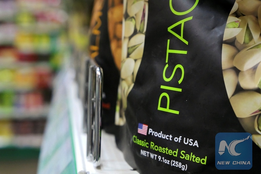 A bag of pistachios produced in the United States is placed among nuts and photographed in a shop in Beijing, China April 6, 2018. (Xinhua/REUTERS)