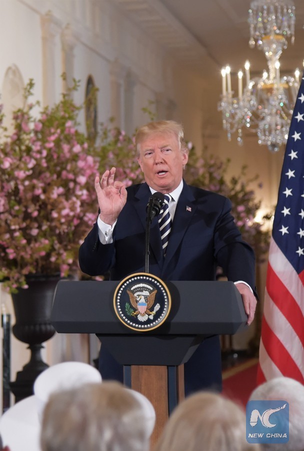U.S. President Donald Trump speaks at a joint press conference with French President Emmanuel Macron (not in the picture) at the White House in Washington D.C., the United States, April 24, 2018. (Xinhua/Yang Chenglin)