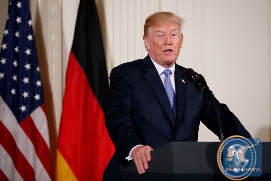 U.S. President Donald Trump speaks during a joint press conference with German Chancellor Angela Merkel (not in the picture) at the White House in Washington D.C., the United States, on April 27, 2018. (Xinhua/Ting Shen)