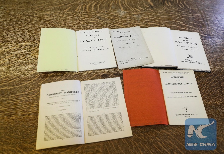 Photo taken on April 17, 2018 shows different English editions of "The Communist Manifesto" at the Working Class Movement Library in Salford, Britain. (Xinhua/Han Yan)