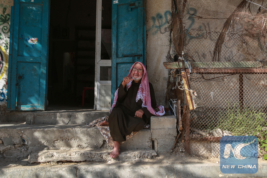 80-year-old Palestinian refugee Suleiman Radwan sits in front of his house in a refugee camp in Gaza Strip. (Xinhua)