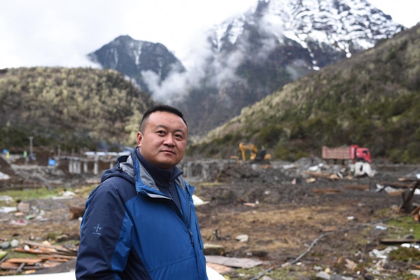Photo taken on May 9, 2018 shows Hu Xuemin, head of the Yumai Township government at a construction site. Hu came to serve as the head of the township government in 2016. (Xinhuanet/Ma Yimeng)