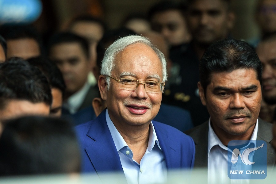 Former Malaysian Prime Minister Najib Razak (L) leaves after being questioned at Malaysian Anti-Corruption Commission (MACC) headquarters in Putrajaya, Malaysia, May 22, 2018. (Xinhua/Chong Voon Chung)