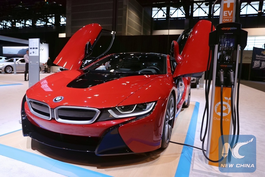 A BMW i8 sports car is on display at the 2017 Chicago Auto Show at McCormick Place in Chicago, Illinois, the United States on Feb. 9, 2017. (Xinhua/Wang Ping)
