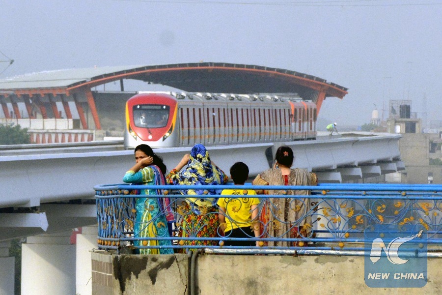Photo taken on May 16, 2018 shows people watching the Orange Line Metro Train (OLMT) during a test run in eastern Pakistan's Lahore. Pakistan on Wednesday made a test run of its first metro train service in Lahore, the capital of the country's eastern Punjab province, from Dera Gujran to Lakshmi Chowk on a 12-km portion of the total 27.1-km route. A total of 27 sets of trains, each comprising five cars, will be used for the service in the OLMT project, a part of the China-Pakistan Economic Corridor (CPEC). (Xinhua/Sajjad)