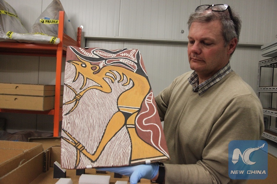 A staff member presents a bark painting, which will be shipped to China for exhibition, at the National Museum of Australia in Canberra, Australia, on May 3, 2018. (Xinhua/Xu Haijing)