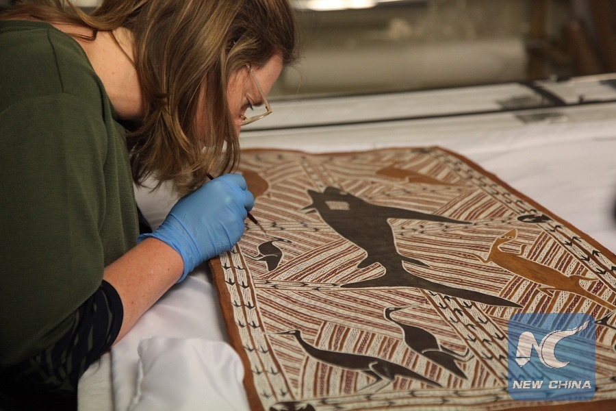 Conservation workers repair bark paintings, which will be shipped to China for exhibition, at the National Museum of Australia in Canberra, Australia, on May 3, 2018. (Xinhua/Xu Haijing)