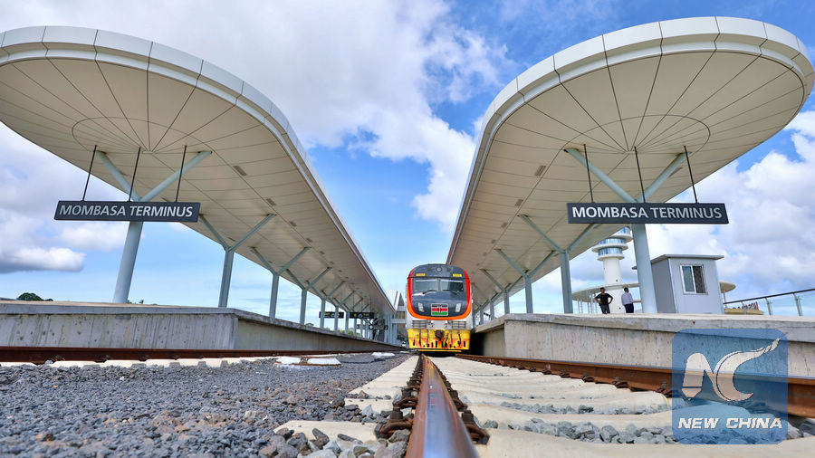 A train of the Chinese-built Mombasa-Nairobi Standard Gauge Railway is seen at the Mombasa Railway Station in Mombasa, Kenya, on June 1, 2018. (Xinhua/Wang Teng)