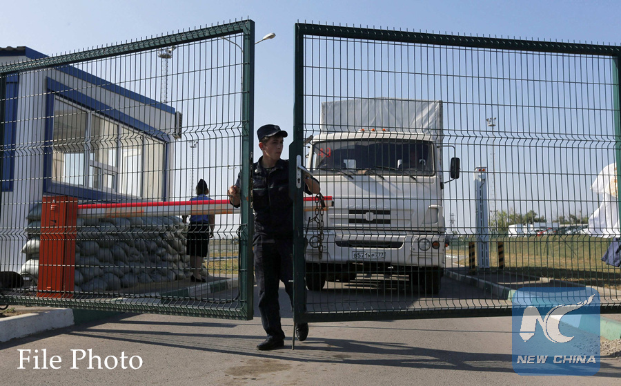 A Russian border guard opens a gate in front of a truck from a convoy that delivered humanitarian aid for Ukraine on its return to Russia at border crossing point "Donetsk" in Russia's Rostov Region August 23, 2014. (Xinhua/Reuters)