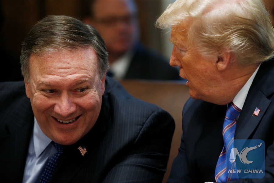 U.S. President Donald Trump talks to Secretary of State Mike Pompeoduring a cabinet meeting at the White House in Washington, U.S., July 18, 2018. (Xinhua/REUTERS)