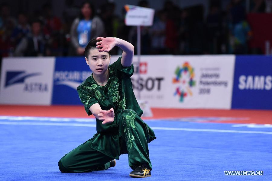 Tang Lu of China competes during the Women's Nanquan & Nandao All-Round at the 18th Asian Games in Jakarta, Indonesia Aug. 19, 2018. (Xinhua/Pan Yulong)