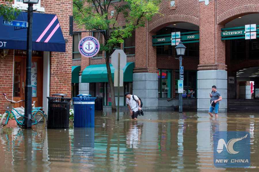 People cross the street as water floods outside buildings in Old Town Alexandria, Virginia, the United States, on Sept. 11, 2018. (AFP Photo)