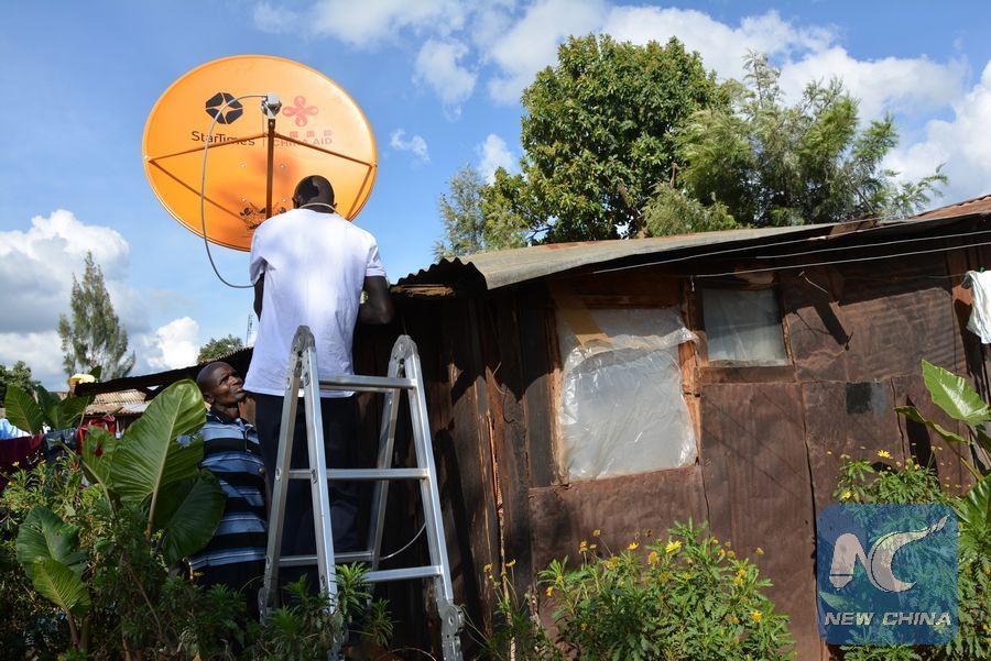 StarTimes employees install the satellite television device at the Likii village in the central Kenyan county of Laikipia, July 3, 2018. (Xinhua/Jin Zheng)
