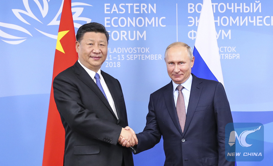 Chinese President Xi Jinping (L) holds talks with Russian President Vladimir Putin in Vladivostok, Russia, Sept. 11, 2018. (Xinhua/Xie Huanchi)