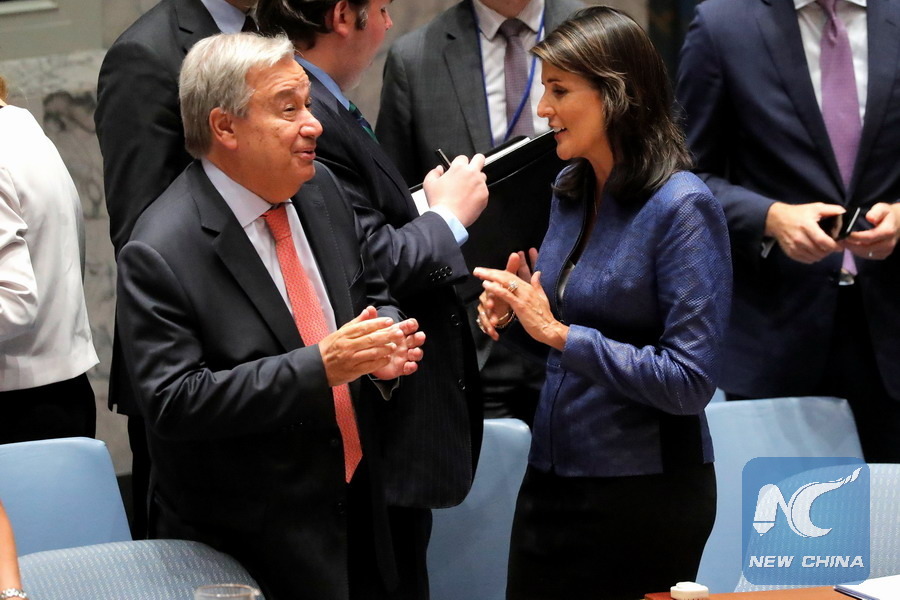U.S. Ambassador to the United Nations Nikki Haley speaks with U.N. Secretary General Antonio Guterres before a meeting of the Security Council at U.N. headquarters in New York City, New York, U.S., Aug. 23, 2018. (Xinhua/REUTERS)
