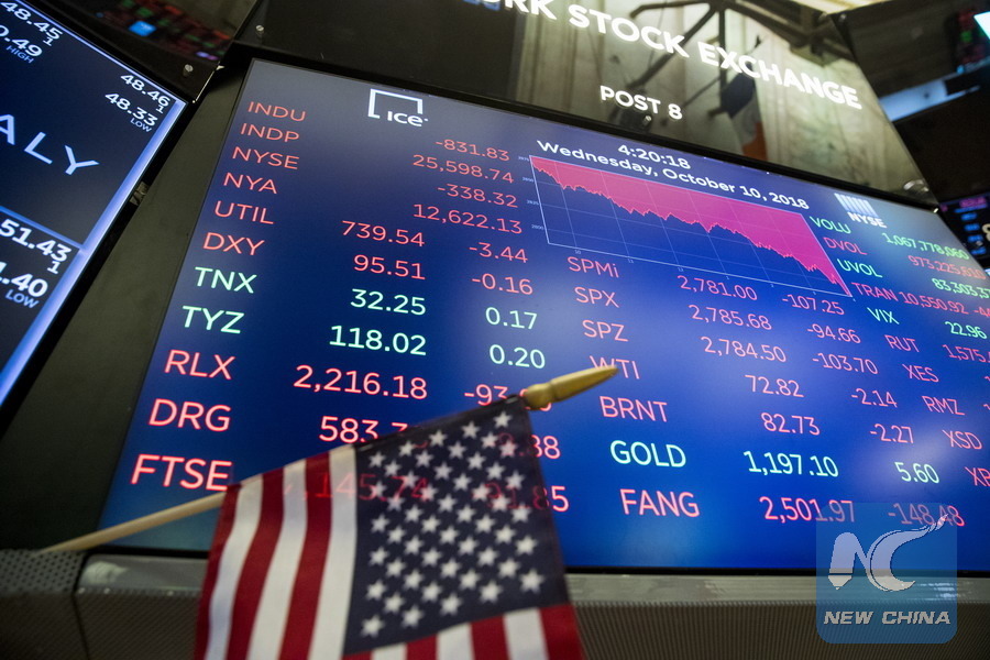 Electronic screen shows the closing numbers at the New York Stock Exchange in New York, the United States, Oct. 10, 2018.(Xinhua/Wang Ying)