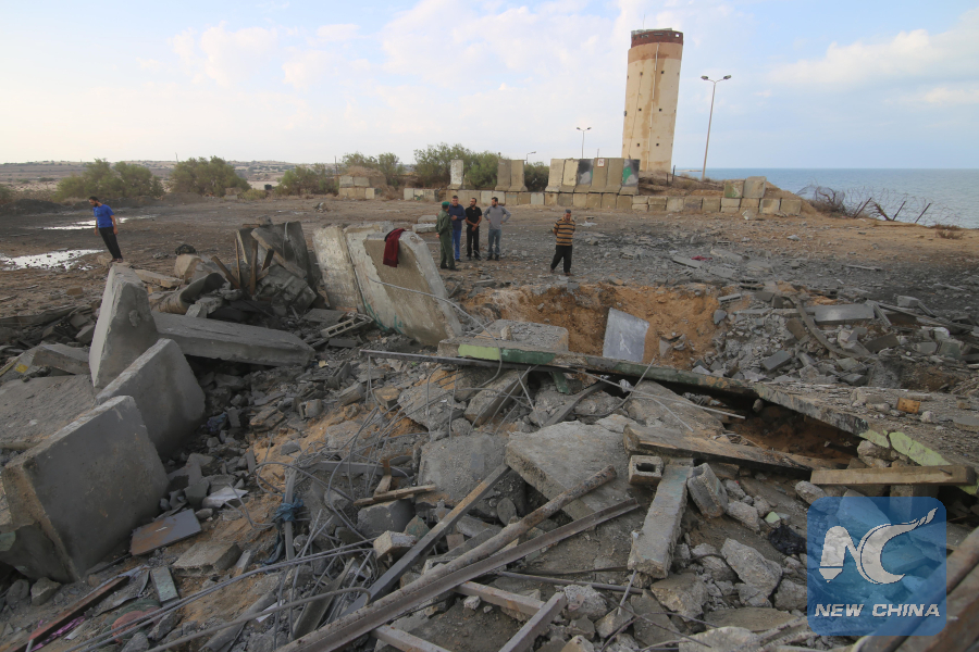 Palestinians inspect the rubbles following an Israeli airstrike in the southern Gaza Strip city of Rafah, on Oct. 17, 2018. (Xinhua/Khaled Omar)