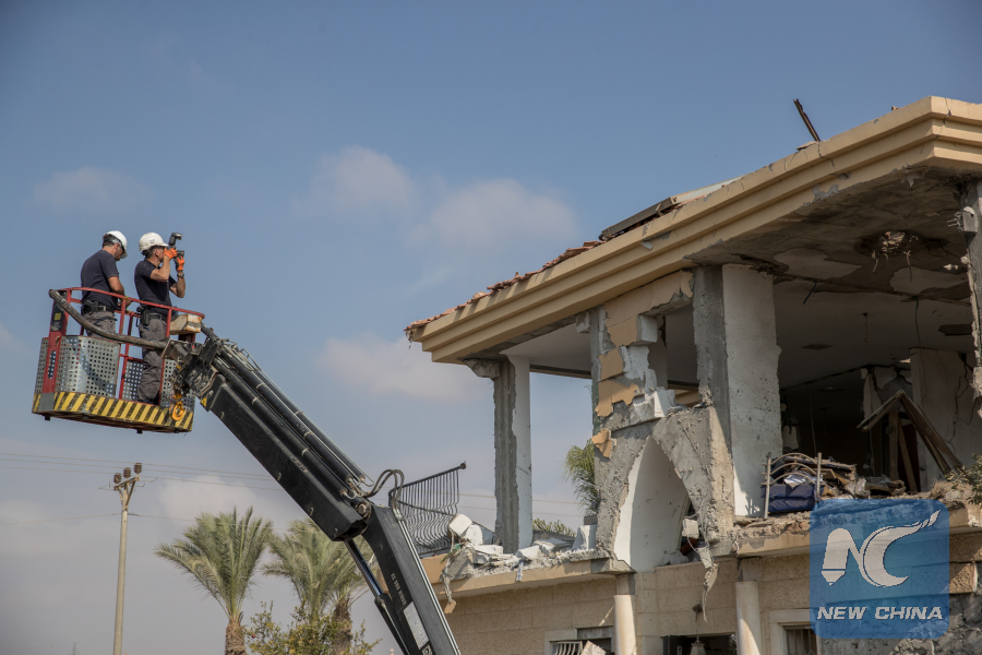 Israeli Police examine a house that suffered from a rocket fire allegedly by militant groups from the Gaza Strip, in Beersheba, southern Israel, on Oct. 17, 2018. (Xinhua/JINI)