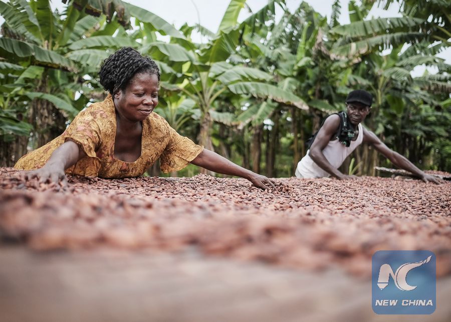 Farmers handpick cocoa beans for drying in Suhum, east Ghana, Oct. 29 , 2017. (Xinhua/Dennis Akuoku-Frimpong)