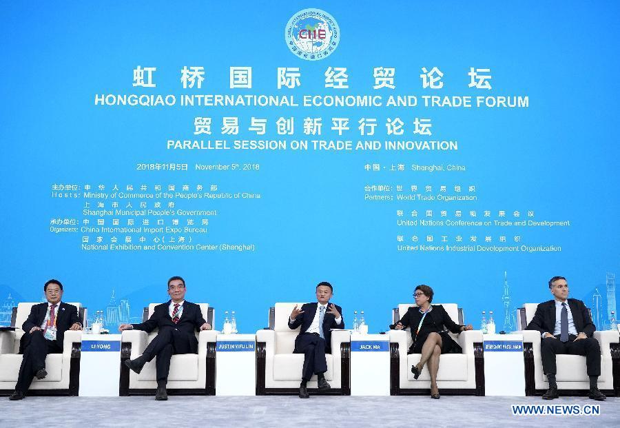 Jack Ma (C), executive chairman of Alibaba Group, speaks at the Parallel Session on Trade and Innovation of the Hongqiao International Economic and Trade Forum in Shanghai, east China, Nov. 5, 2018.(Xinhua/Shen Bohan)