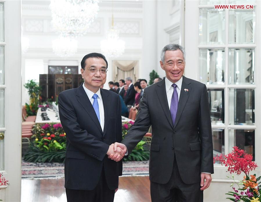 During their talks late Monday, Li and Singaporean Prime Minister Lee Hsien Loong witnessed the signing of a series of agreements on bilateral cooperation, including an upgrade of free trade agreement (FTA), with both sides pledging to push for progress on key regional issues.