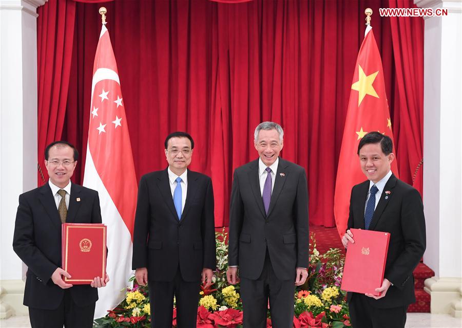 Chinese Premier Li Keqiang (2nd L) and Singaporean Prime Minister Lee Hsien Loong (2nd R) witness the signing of cooperation documents on upgrading the two countries' free trade agreement, connectivity, finance, science and technology, environment, culture and customs after their talks in Singapore, Nov. 12, 2018. (Xinhua/Shen Hong)