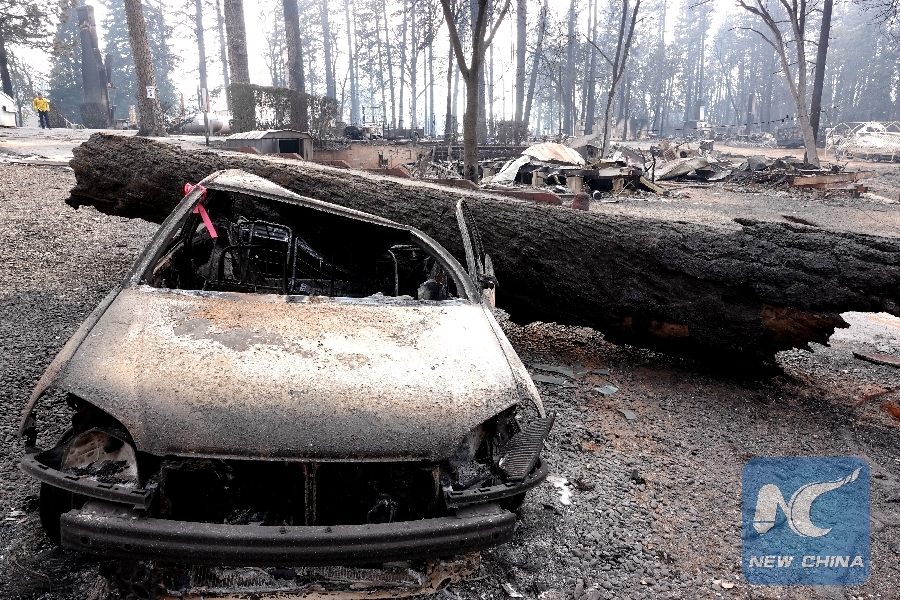 Photo taken on Nov. 20, 2018 shows the wreckage in the site where the wildfire engulfed in Paradise of Butte County, California, the United States. (Xinhua/Wu Xiaoling)