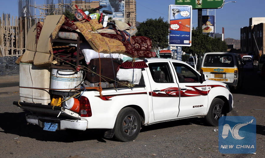 Displaced people from Hodeidah ride in a vehicle in Sanaa, Yemen, Nov. 14, 2018. (Xinhua/Mohammed Mohammed)