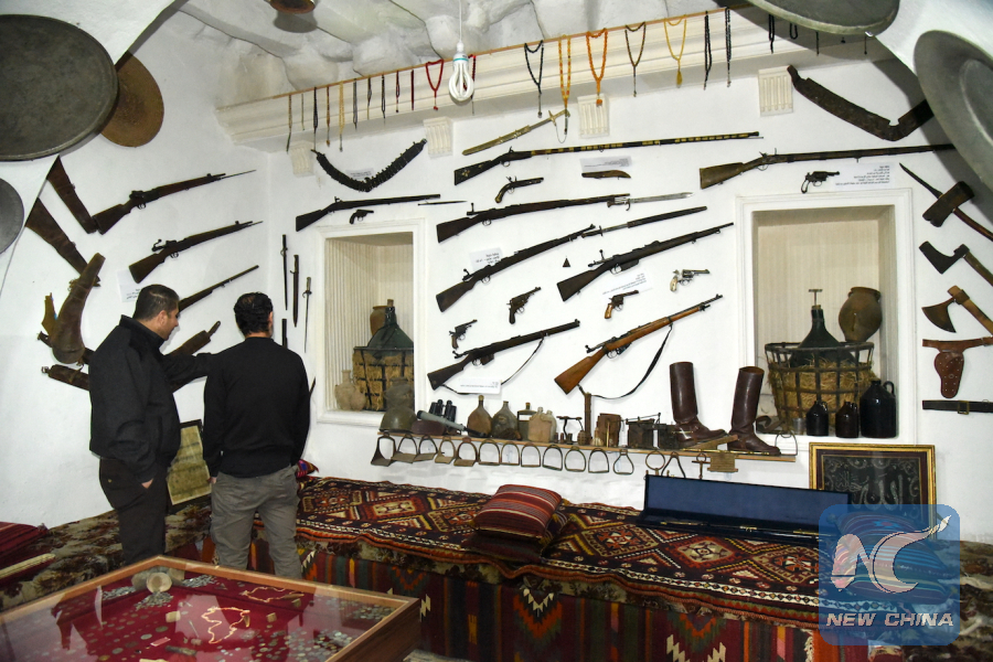 Photo taken on Nov. 13, 2018 shows visitors touring the guest house of Esmat Zain al-Deen, a man who has turned his guest house into a small museum in Sweida, Syria. (Xinhua/Hummam Sheikh Ali)