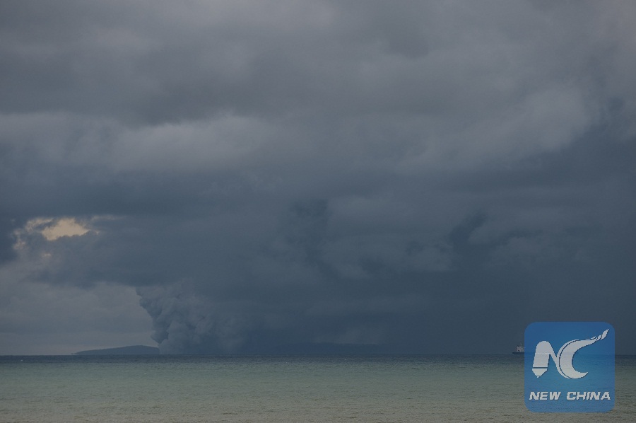The photo shows volcano Anak Krakatau is seen from Anyer beach in Banten Provinece, Indonesia, on Dec. 26, 2018. (Xinhua/Veri Sanovri)