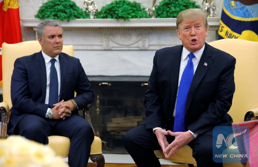 WASHINGTON, Feb. 13 (Xinhua) -- U.S. President Donald Trump and visiting Colombian President Ivan Duque on Wednesday announced their decision to strengthen bilateral relations and highlighted cooperation on the Venezuela issue.