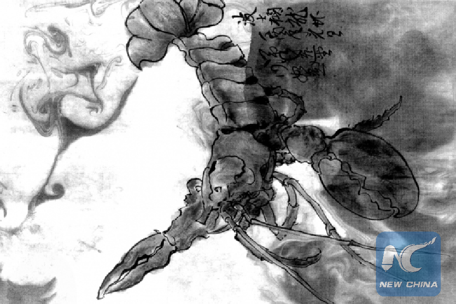 A Boston lobster by Chinese ink wash painting and calligraphy, which uses simple lines with a variant of texture, orientation, and depth to capture the essence of subjects including lobster, rock and wave. (Credit: Yangsheng Li)