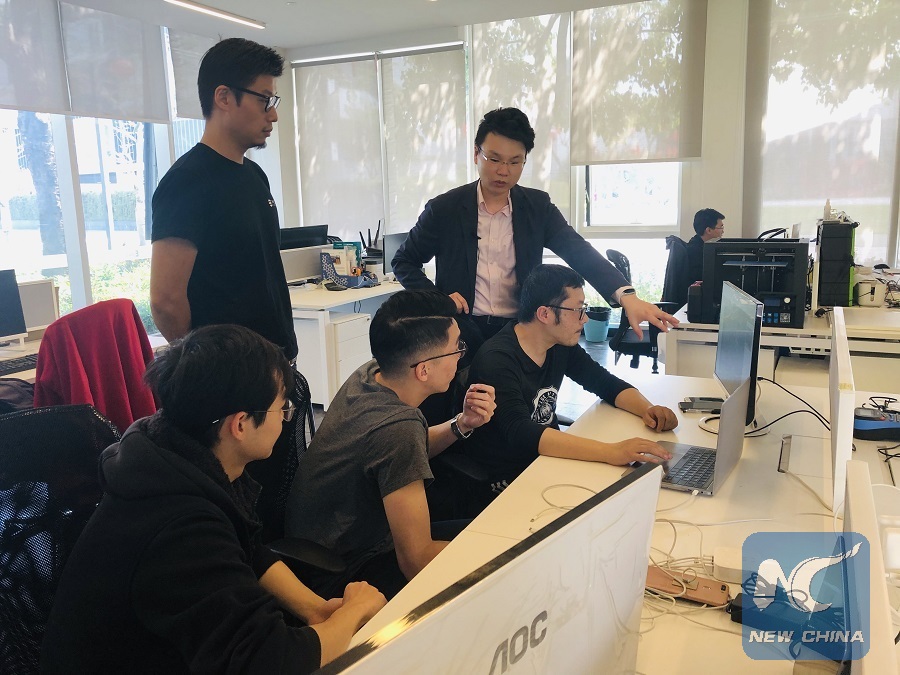 Abraham Lam (Standing, R) talks with the staff in the office of his company in Shenzhen's Qianhai, south China's Guangdong Province, Feb. 14, 2019. (Xinhua/Gao Jie)