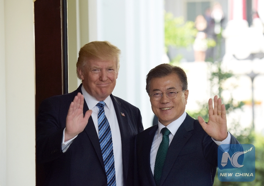 File Photo: U.S. President Donald Trump (L) welcomes South Korean President Moon Jae-in at the White House in Washington D.C., the United States, on June 30, 2017. (Xinhua/Yin Bogu)
