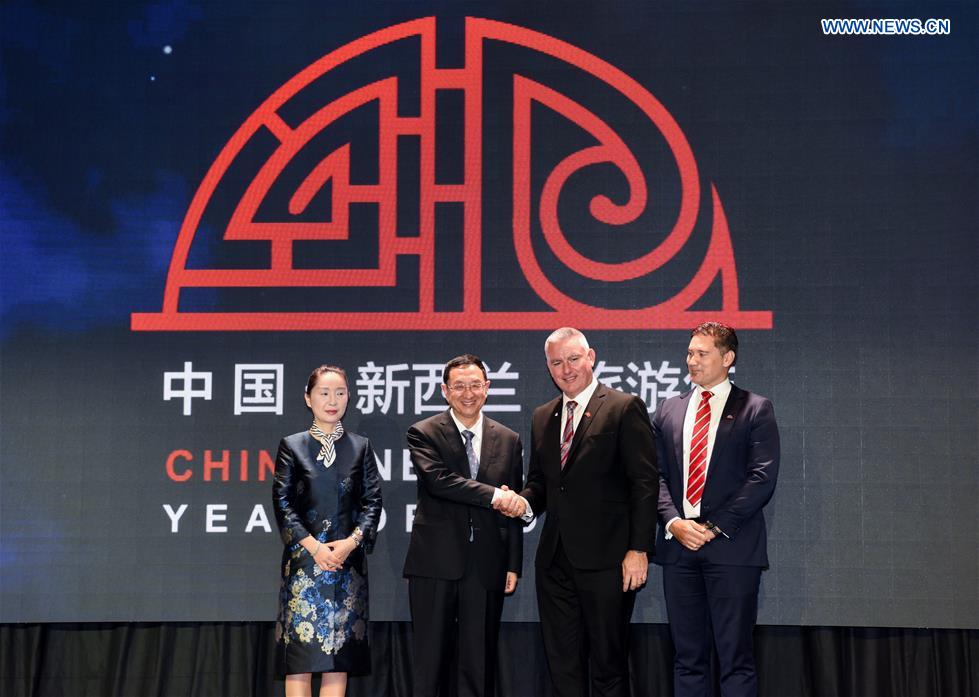 (From L to R) Chinese Ambassador to New Zealand Wu Xi, China's Minister of Culture and Tourism Luo Shugang, New Zealand Tourism Minister Kelvin Davis and Jamie Tuuta, acting chair for New Zealand Tourism Bureau, attend the opening ceremony of the 2019 China-New Zealand Year of Tourism in Wellington, New Zealand, March 30, 2019. (Xinhua/Guo Lei)