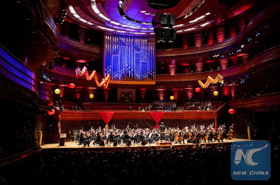 Musicians from the Philadelphia Orchestra and Shanghai Philharmonic Orchestra perform during their Chinese New Year Concert in Philadelphia, the U.S. state of Pennsylvania, Jan. 29, 2019. (Xinhua/Wang Ying)