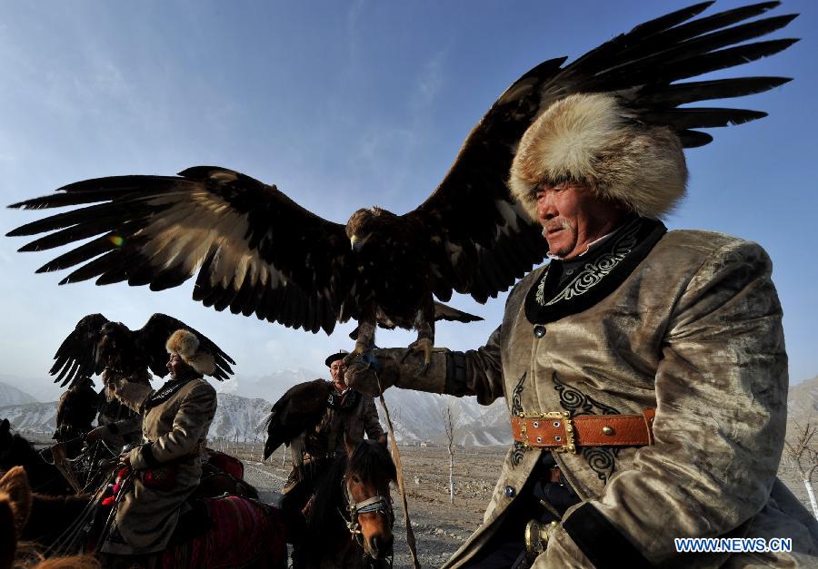 Herdsmen of Kirgiz ethnic group ride with their falcons in Akqi County, northwest China's Xinjiang Uygur Autonomous Region, March 20, 2011. China will hold the Conference on Dialogue of Asian Civilizations starting from May 15. Under the theme of "exchanges and mutual learning among Asian civilizations and a community with a shared future," the conference includes an opening ceremony and sub-forums. (Xinhua/Jin Wei)