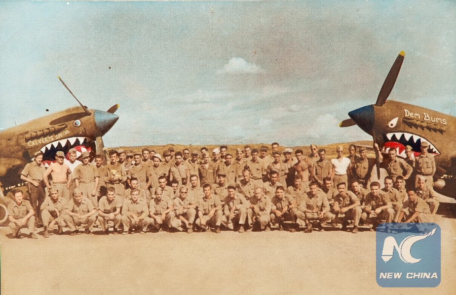 Members of the 76th Squadron of the 23rd Fighter Group of the 14th U.S. Air Force, in which Flying Tiger pilot Glen Beneda served as a pilot, pose for photos in front of two shark-teeth fighter planes in China during the World War II. (Xinhua)