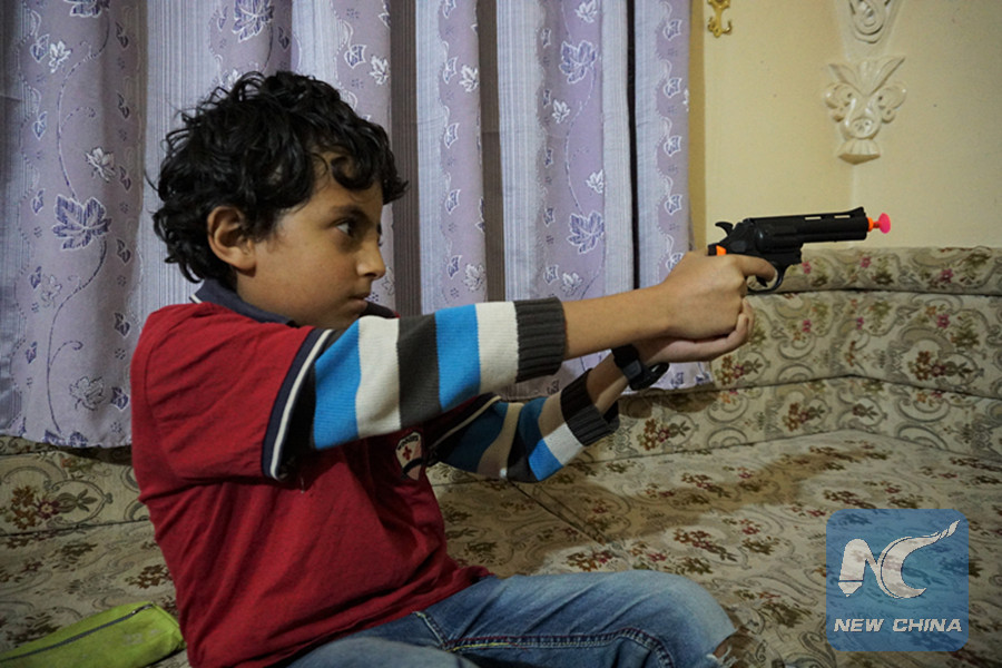 Yahya Motahar's son Rawouf plays with a toy gun at home in Sanaa, Yemen, on May 25, 2019. (Xinhua/Mohamed al-Azaki)