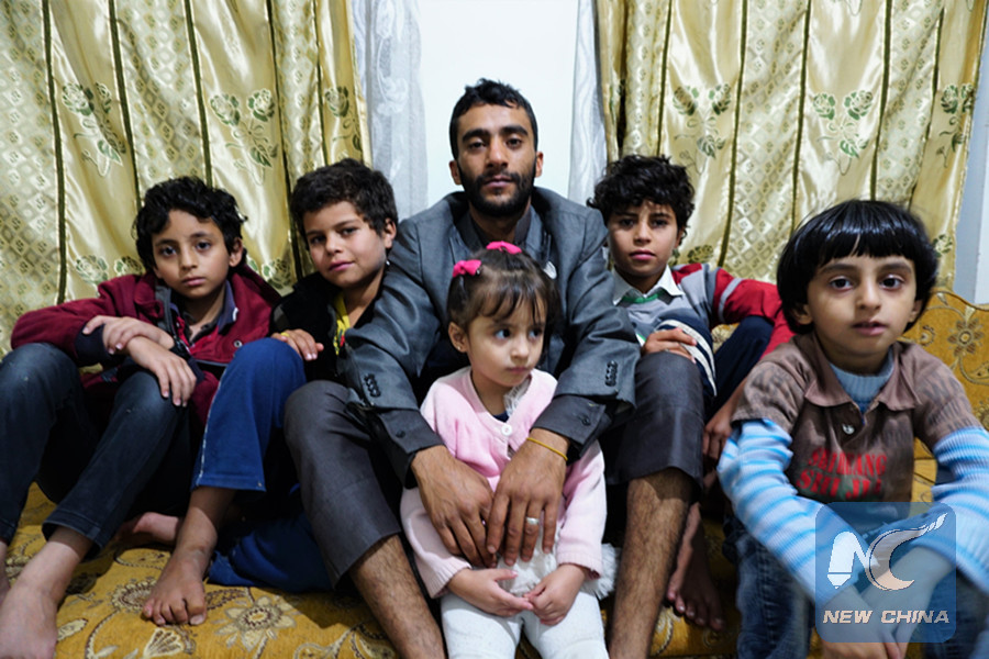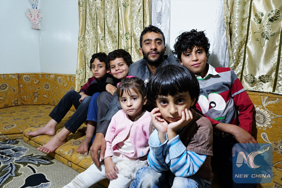 Yahya Motahar (C) and his children pose for photos at home in Sanaa, Yemen, on May 25, 2019. (Xinhua/Mohamed al-Azaki)