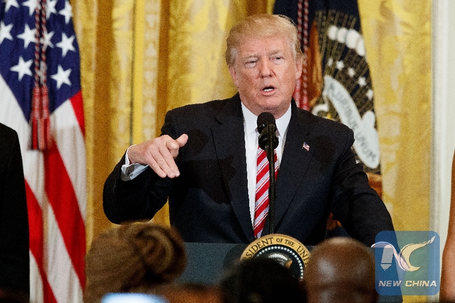 FILE PHOTO: U.S. President Donald Trump speaks during a National African American History Month reception at the White House in Washington D.C., the United States, Feb. 13, 2018. (Xinhua/Ting Shen)