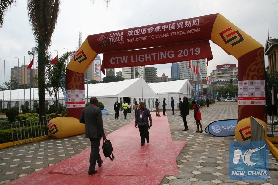 A trader (L) converses with customers during the 5th Edition of China Trade Week at Kenyatta International Convention Center (KICC) in Nairobi, capital of Kenya, June 7, 2019. China Trade week is a series of successful Business-to-Business (B2B) and Business-to-Government (B2G) trade platforms across the Middle East and Africa covering multiple industries including building and construction materials, lighting, furniture and interior, technology, agriculture, textiles and auto parts. (Xinhua/Charles Onyango)