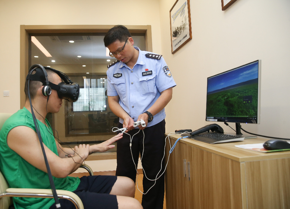 Photo taken on June 22, 2018 shows a drug user applying VR treatment equipments at a local addictin treatment center in Shanghai. (Xinhua/Ding Ting)
